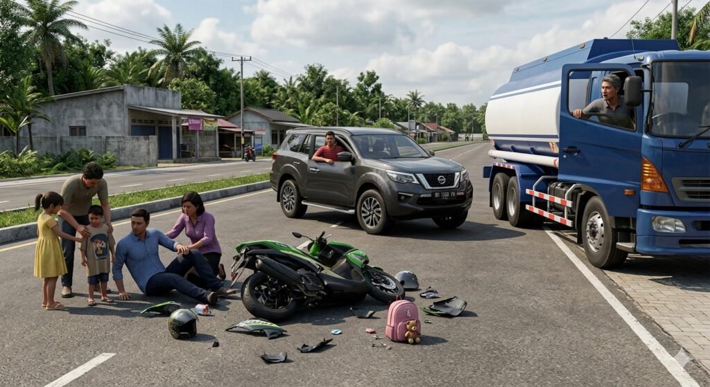 Peristiwa naas tersebut melibatkan sepeda motor dengan nomor polisi KB 2782 G, sebuah mobil SUV berplat BH 1559 YM, serta satu unit truk tangki dengan nomor polisi KB 8645 WB.