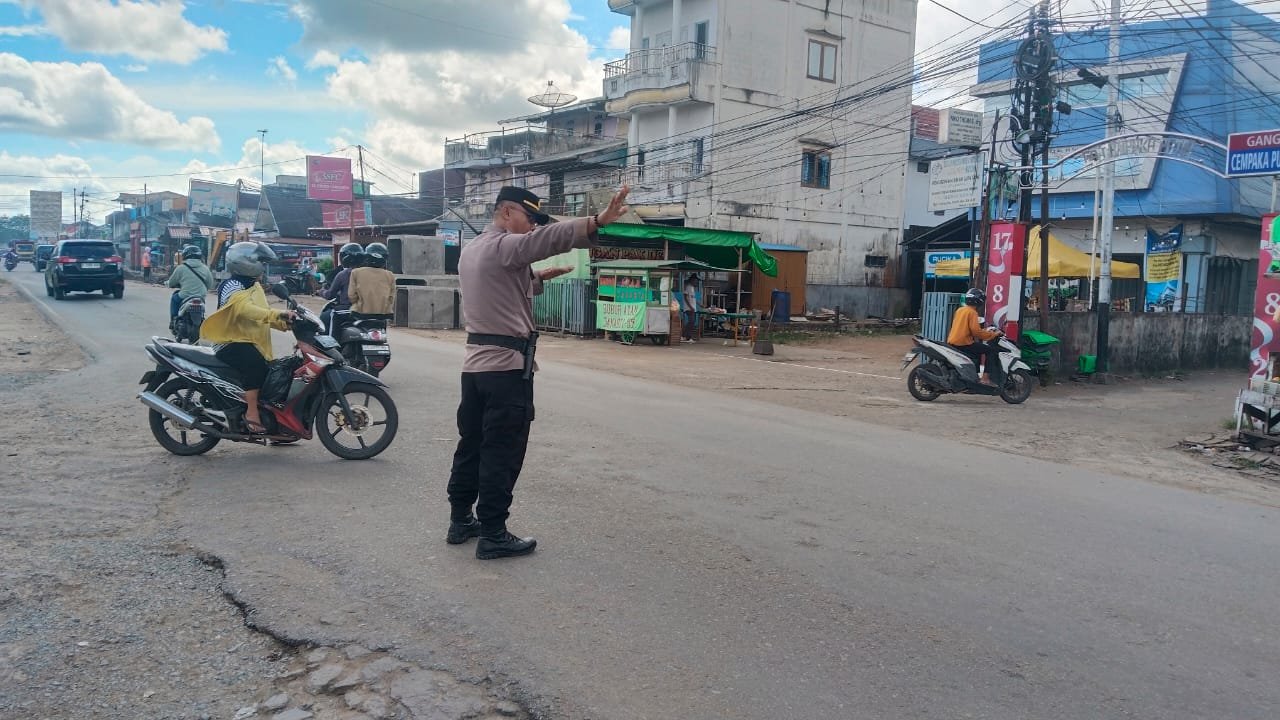 Tidak hanya berjaga di pos, personel juga melakukan patroli jalan kaki di sekitar Pasar Parit Baru dan melakukan pengaturan lalu lintas guna mencegah penumpukan kendaraan.