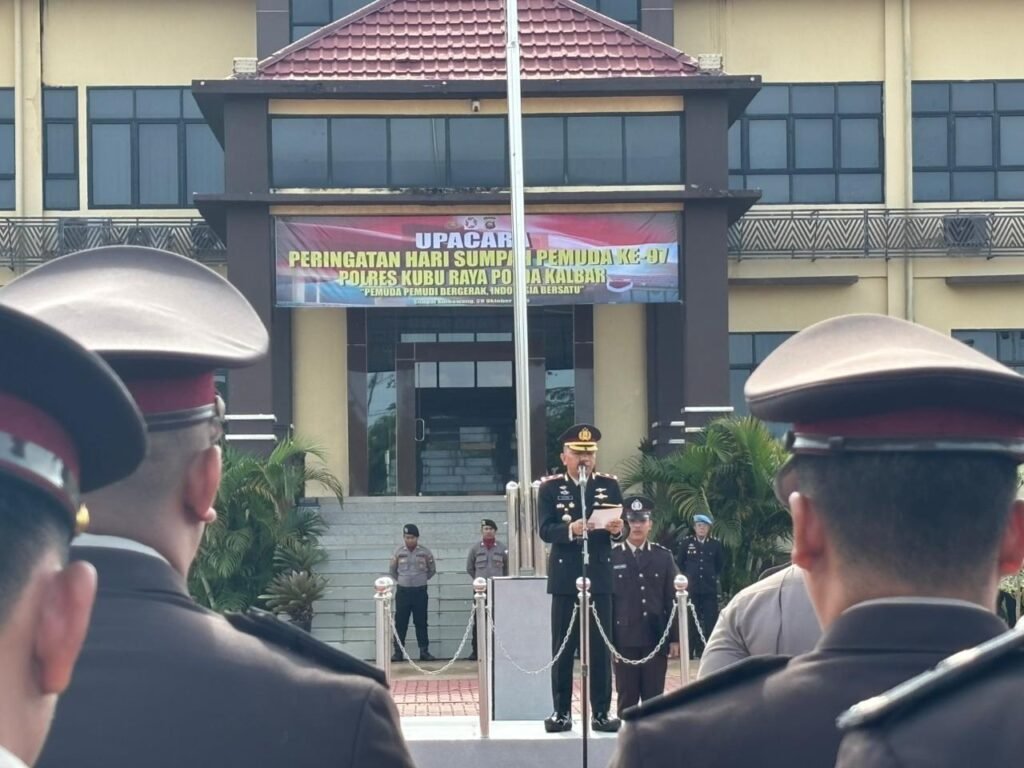 Dalam amanatnya, Wakapolres Kubu Raya membacakan pesan Menteri Pemuda dan Olahraga Republik Indonesia, Dr. (H.C.) H. Erick Thohir, B.A., M.B.A., yang menegaskan makna penting Sumpah Pemuda sebagai simbol persatuan dan tekad generasi muda dalam membangun bangsa.