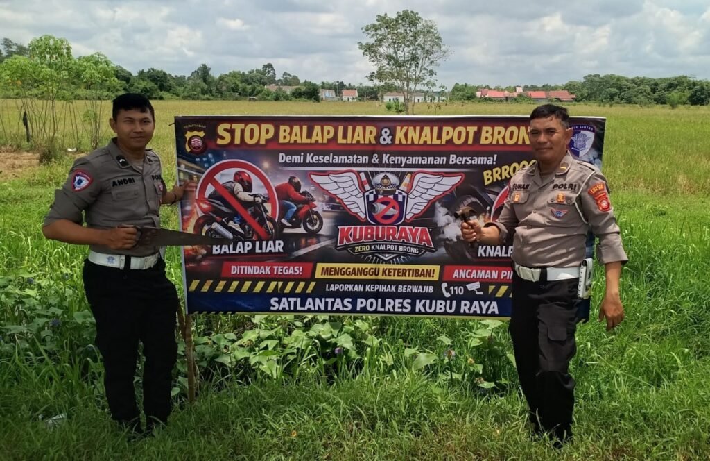 TBNEWSPOLRESKUBURAYA.ID – Satuan Lalu Lintas Polres Kubu Raya terus menggencarkan upaya edukasi kepada masyarakat untuk menciptakan lalu lintas yang aman dan tertib. Salah satunya dengan memasang banner imbauan bertuliskan “Zero Knalpot Brong” di sejumlah ruas jalan strategis di Kabupaten Kubu Raya, Kalimantan Barat.